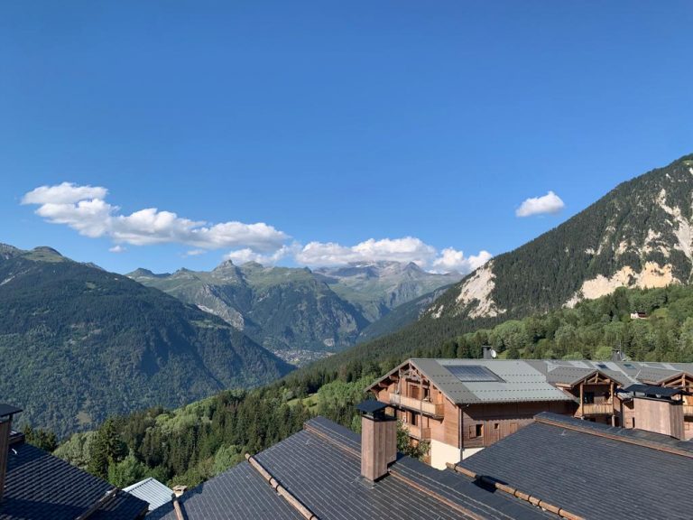 L’appartement dispose d’une grande pièce de vie avec son salon cosy, une cheminée insert à bois, son espace repas convivial, une cuisine américaine équipée Bulthaup et sa magnifique terrasse ouvrant sur la vallée.